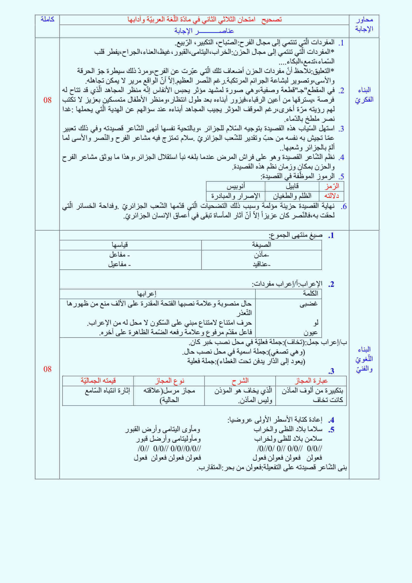 امتحان الفصل الثاني في مادة اللغة العربية للسنة الثالثة ثانوي