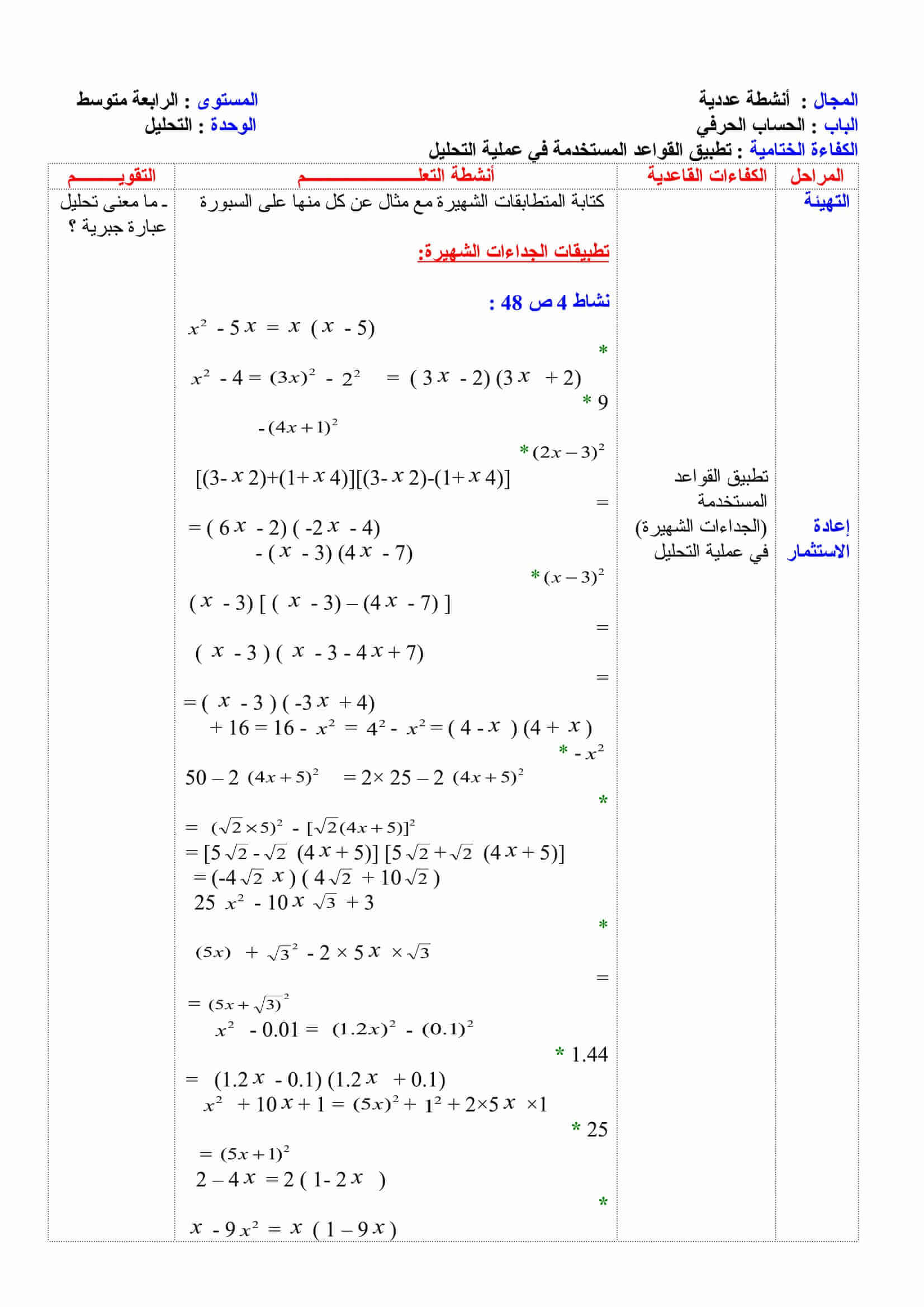 درس تطبيق القواعد المستخدمة في عملية التحلي للسنة 4 متوسط